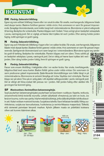 Flerårig. Dekorativ blikfang. Posen indeholder frø til ca. 30 planter. Forspiring i januar-december, sås i maj-juni og blomstrer i august-november. Højde ca. 250 cm. Egner sig som solitær blikfang i haven eller i en smuk krukke. Får smalle, overhængende, blågrønne blade med skarpe kanter. Bladende forbliver grønne i milde vintre. Hvis sommeren er varm får græsset imponerende, fjeragtige blomsterstande, som holder langt ind i vintermånederne. Blomsterne er yderst velegnet til tørring. Beskyrttes for vinterkulde. Planten klippesned i foråret. Trivessolrigt på en beskyttet vokseplads i porøs, nærringsrig jord. Det er vigtigt, at frøene blot trykkeslet ned i jorden. Efter såning holdes jorden fugtig, indtil spiringen er godt igang.