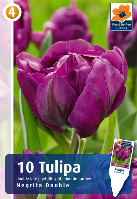 Højde 40-45 cm løgstør. 11/12. Dobbelte sent blomstrende tulipaner, har smukke pæon lignende, store dobbelte blomster, der holder længe. Fantastiske til kanter og buketter.