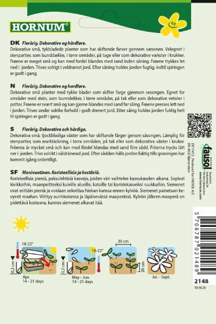 Sedum, blanding Stenurt. Flerårig. Dekorative og hårdføre. Bi- og insektvenlig. Dekorative små, tykbladede planter som har skiftende farver gennem sæsonen. Velegnet i stenpartier, som bundække, i tørre områder, på tage eller som dekorative vækster i krukker. Frøene er meget små og kan med fordel blandet med sand inden såning. Frøene trykkes let ned i jorden. Trives solrigt i veldrænet jord. Efter såning holdes jorden fugtig, indtil spiringen er godt i gang. Forspiring: Apr. (14-21 dage). Såning: Maj.-Jun. (14-21 dage) Blomstring: Jul.-Sept. Højde: 20-30 cm.