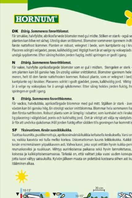 Kulørte, halvfyldte blomster i orange, røde, gule og hvide nuancer. Posen indeholder frø til ca. 15 planter Velegnet i bed, altankasse eller krukke. Kronbladene kan spises - velegnet som farvepift i salatskålen. Trives i sol til halvskygge i mager og veldrænet jord. Sås i Maj/Jul. Blomstre i Jun/Sept.