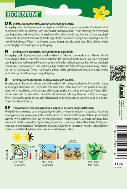 Etårig. stærk aromatisk, hurtigt voksende og bladrig. Posen indeholder frø til ca. 500 planter. Behagelig smag, særlig velegnet som krydderurt til frisk- og grøntsagsretter. Friske blade og frø er velegnet som ingrediens ved fremstilling af kryddereddike eller syltede agurker. Kan enten dyrkes på friland eller i vindueskarm. Placeres i sol til halvskygge. Trives i næringsrig, porøs, fugtig og veldrænet jord. Sås hele året, indendørs om vinteren.