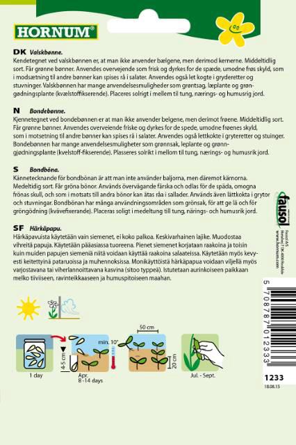 Valskbønne. Kendetegnet ved valskbønnen er, at man ikke anvender bælgene, men derimod kernerne. Posen indeholder frø til ca. 18 planter. Middeltidlig sort. Får grønne bønner. Anvendes overvejende som frisk og dyrkes for de spæde, umodne frøs skyld, som i modsætning til andre bønner kan spises rå i salater. Anvendes også let kogte i gryderetter og stuvning. Valskbønnen har mange anvendelsmulighedder som grøntsag, læplante og grøngødningsplante. Placeres solrigt. Trives i mellen til tung, nærings- og humusrig jord. Sås i april. Høstes i juli til september.