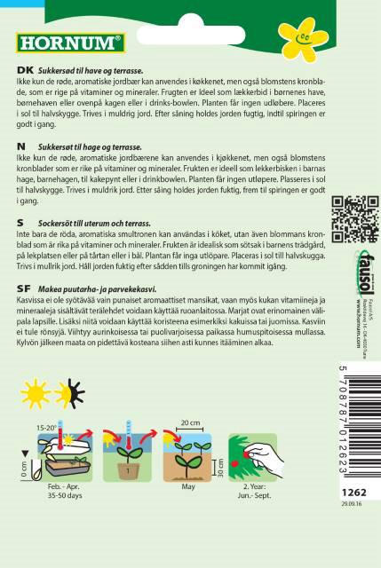 Sukkersød til haven og terrasse. (Poser giver ca. 100 Planter) Ikke kun de røde, aromatiske jordbær kan anvendes i køkkenet, men også blomsternes kronblade, som er rig på vitaminer og mineraler. Frugten er ideel som lækkerbid i børnenes have, børnehaven eller ovenpå kagen eller i drinksbowlen. Planten får ingen udløbere. Placeris i sol til halvskygge. Trives i muldrig jord. Sås i Feb/Apr. Høstes i 2 år: Jun/Sept.