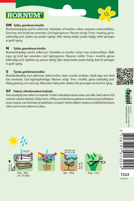 Tykke, grønbrune knolde. (Posen giver ca. 200 Planter) Modstandsdygtige overfor sellerirust. Halvdelen af knolden vokser ovenover jordoverfladen. Såvel top som knold kan anvendes. God lageringsevne. Placeres solrigt. Trives i muldrig, gerne kalkholdig jord. Gødes og vandes rigligt. Sås i Feb/Mar. Høstes i Aug/Okt.