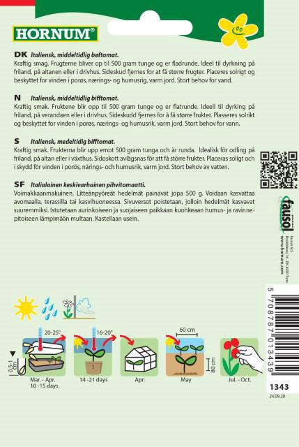 Italiensk, middeltidlig Bøftomat. (Posen giver ca. 30 Planter) Kraftig smag. frugterne blilve op til 500 g. tunge og er fladrunde. Ideel til dyrkning på friland, på altanen eller i drivhus. Placeres solrigt og beskyttet for vinden i porøs, nærings- og humusrig, varm jord. Stort behov for vand. Sås i Mar/Apr. Høstes i Jul/Okt