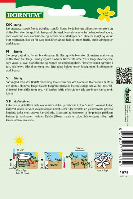 Etårig. (Posen giver ca. 150 Planter) Særpræget, attraktiv, florlet, blanding, som får lilla og hvide blomster. Blomsterne er store og dufter. Blomstrer lange. Friskt lysegrønt bladværk. Navnet stammer fre de lange støvdragere, som vokser ud over kronbladene og minder om edderkoppeben. Placeres solrigt og varmt i tør, veldrænet, ikke alt for tung jord. Sås i Mar/Apr. Blomstre i Jun/Sept.