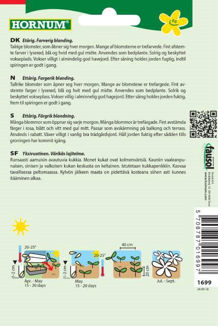 Etårig klatreplante. Hurtigt voksende. (Posen giver ca. 80 Planter) Velegnet til espalier, pergola og hegn. Talrige blomster, som åbner sig hver morgn. Mange af blomsterne er trefarvede i lyserød, blå og hvis med gul midte. Egnet som skærmplante på balkon og terresse. Solrig og beskyttet vokseplads. Trived i kalkholdig og ikke for næringsrig jord. Sås i Maj. Blomstre i Jul/Sept.