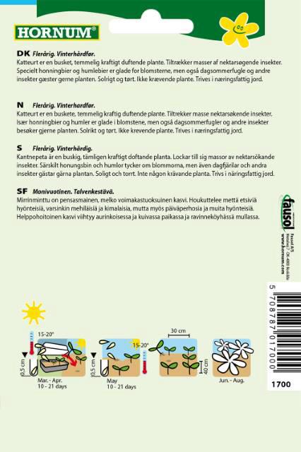 Flerårig. Vinterhårdfør. (Posen giver ca. 150 Planter) Katteurt er en busk, temmelig kraftigt duftende plante. tiltrækker masser af nektarsøgende insekter. Specielt honningbier og humlebier er glade for blomsten, men også dagsommerfugle og andre insekter gæster gerne planten. Solrigt og tørt. Ikke krævende plante. Trives i Næringsfattig jord. Sås i Mar/Apr. Blomstre i Jun/Aug.