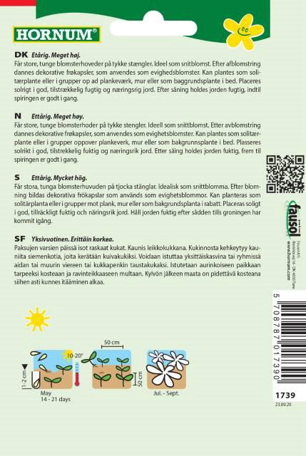 Etårig. Meget Høj. (Posen giver ca. 15 Planter) Får store, tunge blomsterhoveder på tykke stængler. Ideel som snitblomst. kan plantes som solitærplante eller i grupper op ad plankeværk, mur eller som baggrundsplante i bed. Placeres solrigt i god, tilstrækkelig fugtig og næringsrig jord. Sås i Maj. Blomstrer i Jul/Sept.