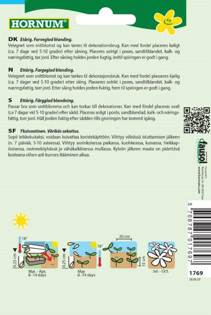 Etårig. Farveglad blanding. (Posen giver ca. 200 Planter) Velegnet som snitblomst og kan tørres til dekorationsbrug. Kan med fordel placeres kæligt (ca. 7 dage ved 5-10 grader) efter såning. Placeres solrigt i porøs, sandtilblandet, kalk, -og næringsfattig, tør jord. Sås i Mar/Apr. Blomstre i Jul/Okt.