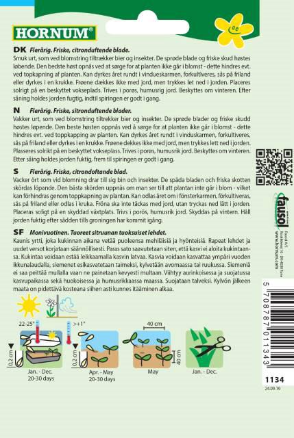 Flerårig. Frisk, citronduftende blade. (Posen giver ca. 150 planter) Smuk urt, som ved blomstring tiltrækker bier og insekter. De sprøde blade og friske skud høstes løbende. Den bedste høst opnås ved at sørge fir at planten ikke går i blomst - dette hindres evt. ved topkapning af planten. Kan Dyrkes året rundt i vinduskarmes, forkultiveres, sås på friland eller dyrkes i en krukke. Frøene dækkes ikke med jord, men trykkkes let ned i jorden. Placeres solrigt på en beskyttet vokseplads. Trives i porøs, humusrig jord. Beskyttes om vinteren Sås i Jan/Dec. Høstes i Jan/Dec