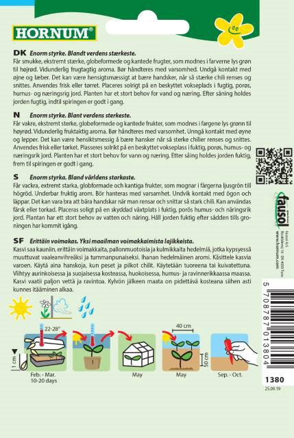 Posens indehold giver ca. 3 planter Enorm styrke. Blandt verdens stærkeste. Får smukke, ekstremt stærke, globe formede og kantede frugter, som modnes i farverne lys grøn til højrød. Vidunderlig frugtagtig aroma. Bør håndteres med varsomhed. Undgå kontakt med øjne og læber. Det kan være hensigtsmæssigt at bære handsker, når så stærke chili renses og snittes. Anvendes frisk eller tørret. Placeres solrigt på en beskyttet vokseplads i fugtig, porøs, humus- og næringsrig jord. Planten har et stort behov for vand og næring. Sås inde Feb-mar, omplantes, udplantes i drivhus eller på friland i maj, høstes sep-okt.