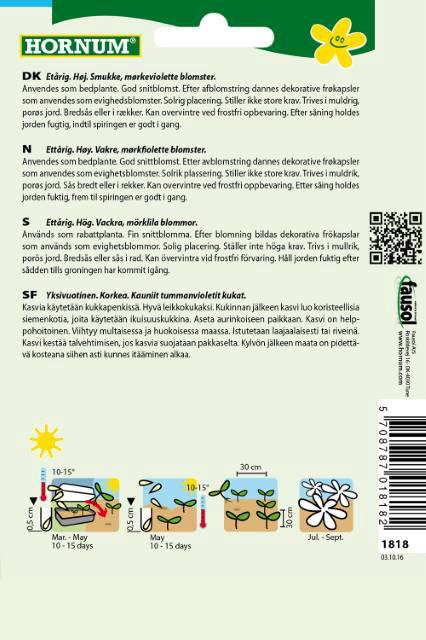 Posens indehold giver ca. 250 planter Etårig. Høj. Smukke mørkeviolette blomster. Anvendes som bedplante. God snitblomst. Efter afblomstring dannes dekorative frøkapsler som anvendes som evighedsblomster. Solrig placering. Stiller ikke store krav. Trives i muldrig, porøs jord. Bredsås eller i rækker. Kan overvintre ved frostfri opbevaring. Sås inde fra marts til maj udplantes i maj og Blomstrer Juli-Sept