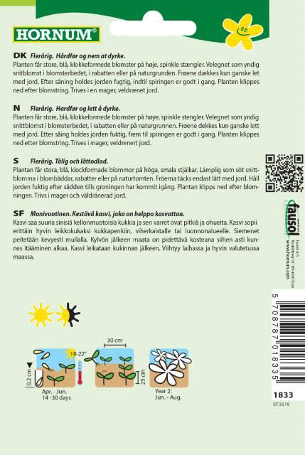 HÅRDFØR OG NEM. Flerårig Posen giver ca. 200 Planter. Store blå klokker på høje spinkle stængler. Trives mange steder og er god til den halvvilde have. Sås i april/juni i på voksestedet eller i spirebakker. Blomstrer i juni-august.