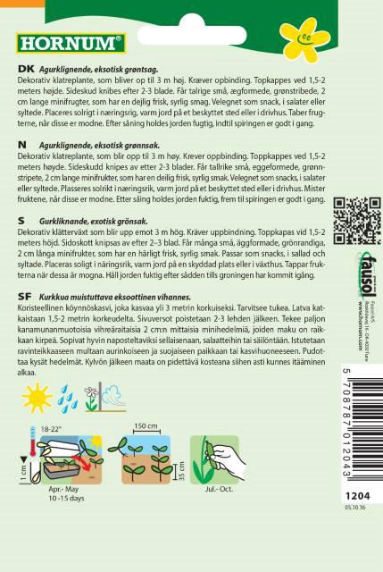 Agurkligende, eksotisk grøntsag. (Posen giver ca. 12 Planter) Dekorativ klatreplante, som bliver op til 3 m høj. Kræver opbinding. Får talrige små, æggeformede, grønstribede, 2 cm lange minifrugter, som har en dejlig frisk, syrlig smag. velegnet som snack i salater, eller sylte. Placeres solrigt i næringsrig. varm Jord på et beskyttet sted eller i drivhus. sås i Apr/Maj. Høstes i Jun/okt.