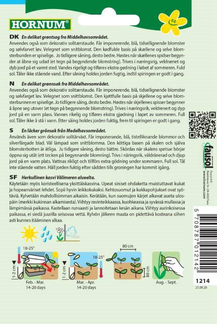 En delikat græntsag fra middelhavsområdet. (Posen giver ca. 20 Planter) Anvendes også som dekorativ solitærstaude. Rår imponerende, blå, tidsellignedne blomster og sølvfarvet løv. Velegnet som snitblomst. Den kødfulde basis på skællene og selve blomsterbunden er spiselig. Jo tidligere såning jo bedre. Trives i næringsrig, veldrænet og dyb jord på et varmt sted. vandes rigeligt og tilføjes ekstra gødning i løbet af sommeren. Fuld sol. Tåler ikke stående vand. Sås i Feb/Mar. Høstes i Aug/sep.