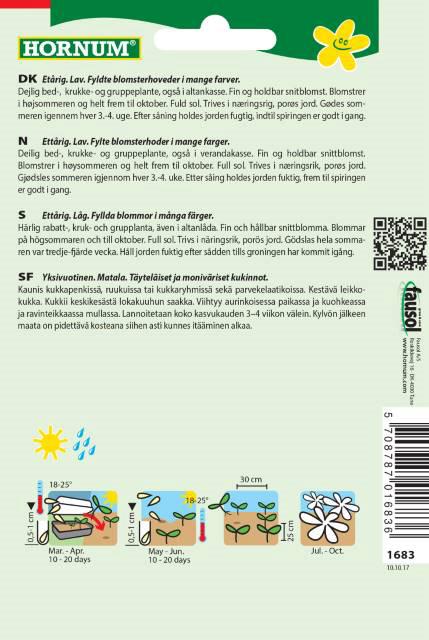 Etårig. lav. fyldte blomsterhoveder i mange farver. (Posen giver ca. 70 Planter) Dejlig bed-, krukke- og gruppeplante, også i altankasse. Fin og holdbar snitblomst. Blomstre i højsommeren og helt frem til okt. Fuld Sol. Trives i næringsrig, porøs jord. Sås i Mar/Apr. Blomstre i Jul/Okt.