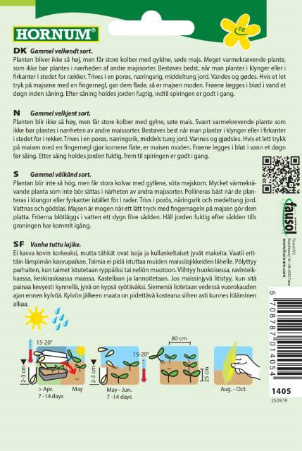 Sås i spirebakke indtil april, sås eller plantes ud fra maj til juni og høstes i august til oktober. Posen indeholder frø til ca. 20 planter Trives solrigt i en porøs, næringsrig, middeltung jord. Bør ikke plantes i nærheden af andre majssorter.