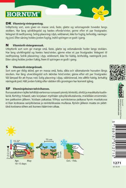 Vitaminrig vinter grøntsag. (Poser giver ca. 80 Planter) Udbytterig sort, som giver en masse små, faste, glatte og velsmagende hoveder lange stokken. Har lang udviklingstid og høstes efterår/Vinter, gerne efter et par frostgrader. Velegnet til nedfrysning. Solrig placering i dyb, veldrænet, ikke for funtig, lerholdig, næringsrig jord. Sås i Apr/Maj. Høstes i Okt/Feb.